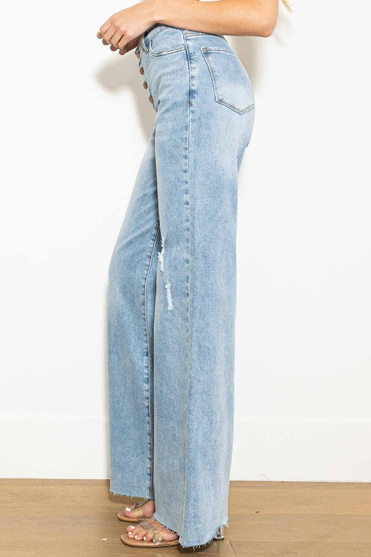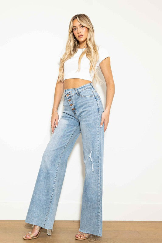 Upgrade your denim collection with these high-rise wide fit jeans that boast a unique criss-cross waistline, adding a modern twist to a classic style. The raw edge leg openings infuse a touch of edginess, while the classic 5-pocket construction offers both style and functionality. Complete with a distinctive 4-button up closure, these jeans are a versatile choice for effortlessly chic looks.