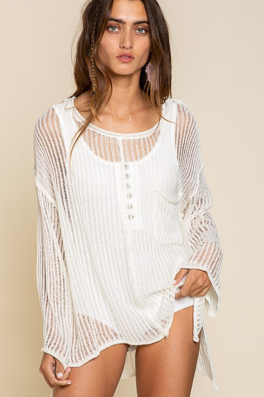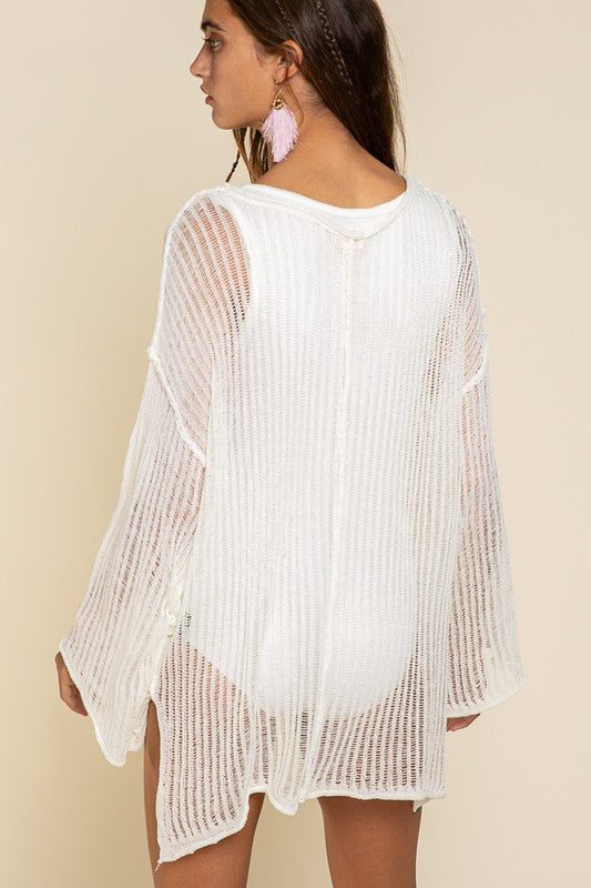 Designed in see-through boat neck sweater top with loosen rib knitting, loose fit with side slit, high-low length, long trumpet sleeve with rolling edge finish and reversed seams on center of front and back